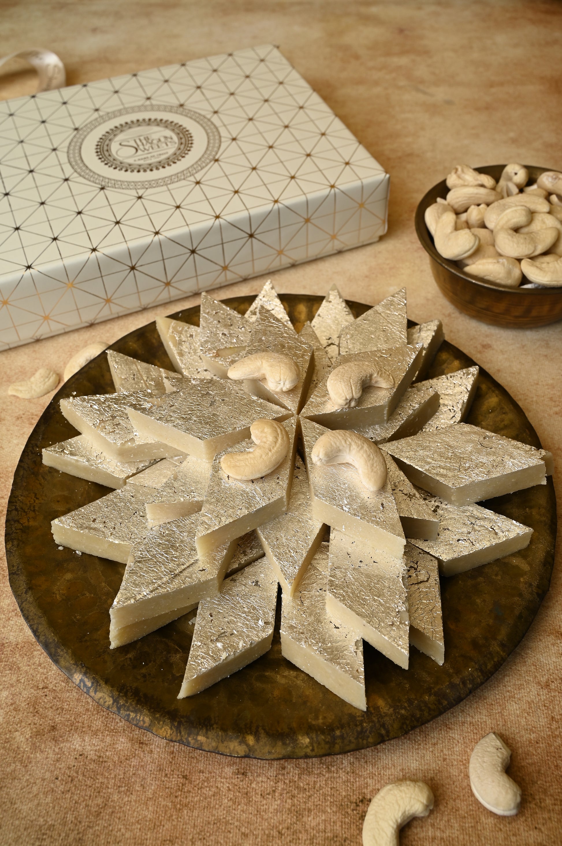 The preparation of Kaju Katli begins with soaking and grinding high-quality cashews into a fine powder. This powder is then mixed with sugar syrup and carefully cooked to the right consistency. The mixture is rolled out thinly and cut into diamond shapes, often adorned with a layer of edible silver leaf (varak) for a touch of elegance. The result is a smooth, rich fudge-like sweet that dissolves effortlessly on the palate.